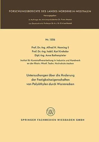 Die thermoelastische Warmreckung von Polyathylen weich und hart bewirkt eine Festigkeitsverschiebung in den Formteilen. Werden die Formteile in der Reckrichtung beansprucht, so kannen sie haher belastet werden. Wenn ver schiedene oder unvorhersehbare Belastungen auftreten kannen, empfiehlt es sich, die Warmformung im Bereich der FlieBtemperatur vorzunehmen. Dadurch blei ben die Eigenschaften des Ausgangsmaterials erhalten. Den Herren JAKEL, MITTROP, OFFERMANN und STRERATH sei an dieser Stelle fiir die Durchflihrung der Versuchsarbeiten herzlich gedankt. Fiir die Lieferung des Versuchsmaterials danken die Verfasser folgenden Firmen: Badische Anilin- & Soda-Fabrik AG, Ludwigshafen, Dynamit Nobel AG, Troisdorf, Farbwerke Hoechst AG, FrankfurtjMain-Hoechst, Kautex-Werke Reinhold Hagen, Hangelar, Rediweld, Crawley, England. Prof. Dr.-Ing. ALFRED H. HENNINGt Prof. Dr.-Ing. habil. KARL KREKELER Dipl.-Ing. ARNE ROTHENPIELER 33 8. Literaturverzeichnis [1] ZOHREN, ]., Spanloses Formen von thermoplastischen Kunststoff-Halbzeugen. Kunststoffe Bd. 51, 1961, Heft 9, S. 620-623. [2] KREKELER, K., und H. PEUKERT, Beitrag zur thermoelastischen Formbarkeit von Polyathylen. Forschungsberichte des Wirtschafts- und Verkehrsministeriums Nord rhein-Westfalen Nr. 327, Westdeutscher Verlag, Koln und Opladen 1956. [3] SCHULZ, G., Die Kunststoffe. Carl Hanser Verlag, Milnchen 1959. [4] HAGEN, H., und H. DOMININGHAUS, Polyathylen und andere Polyolefine. Verlag Brunke Garrels, Hamburg 1961. [5] RICHARD, K., und E. GAUBE, Die Kaltverstreckung bei Niederdruckpolyathylen. Kunststoffe Bd. 46, 1956, Heft 6, S. 262-269. [6] DOMININGHAUS, H., Kaleidoskop der Kunststoffe. Der Plastverarbeiter Bd. 15, 1964, Heft 2, S. 93-100.