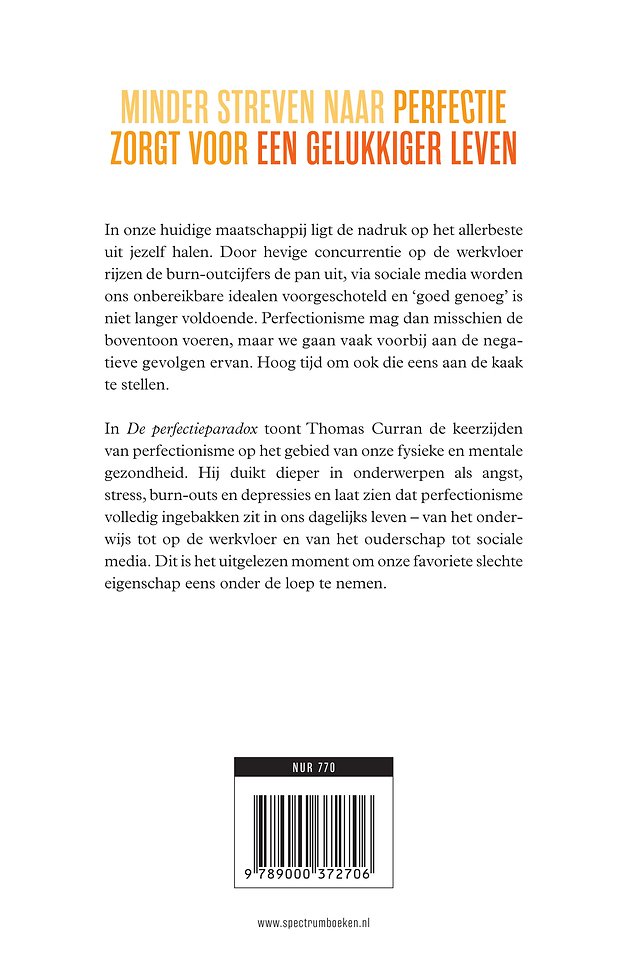 In 'De perfectieparadox' onderzoekt Thomas Curran de negatieve effecten van perfectionisme op onze gezondheid en ons mentale welzijn, zoals angsten, stress, burn-out en depressies. Hij toont aan hoe perfectionisme in alle facetten van ons leven opduikt, van onderwijs tot de arbeidsmarkt en van ouderschap tot sociale media, en breekt een lans voor de middelmatigheid.