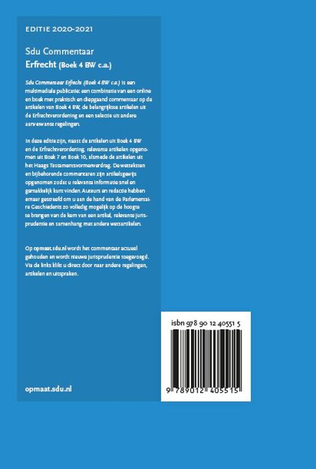 In deze editie van Sdu Commentaar Erfrecht (Boek 4 BW c.a.) zijn, naast de artikelen uit Boek 4 BW en de Erfrechtverordening, relevante artikelen opgenomen uit Boek 7 en Boek 10, alsmede de artikelen uit het Haags Testamentsvormenverdrag.