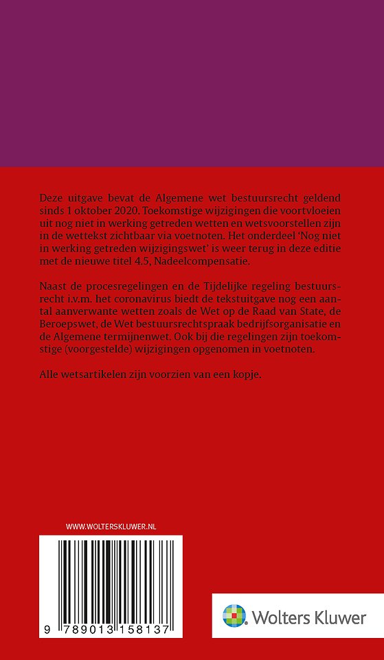 Wanneer u uw weg zoekt in de Algemene wet bestuursrecht, dan vormt Tekstuitgave Algemene wet bestuursrecht 2020/2021 uw primaire bron van actuele informatie. Deze uitgave bevat alle relevante wetteksten geldend sinds 1 oktober 2020. Daarnaast wijst de titel via voetnoten op toekomstige wijzigingen, die voortvloeien uit nog niet in werking getreden wetten en wetsvoorstellen. Dankzij de kopjes en informatieve voetnoten vindt u snel de bepaling die u zoekt binnen de Algemene wet bestuursrecht.