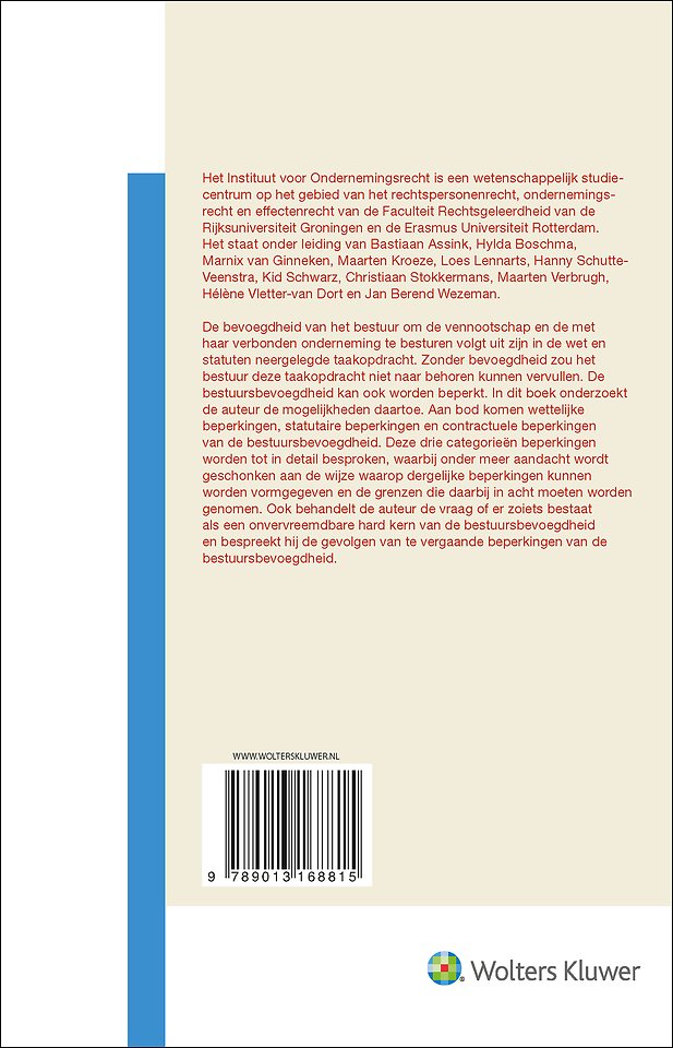 Deze monografie biedt een integrale behandeling van de beperking van de bestuursbevoegdheid. Daarbij passeren diverse fundamentele vennootschapsrechtelijke leerstukken de revue. Er is daarnaast aandacht voor de wijze waarop beperkingen kunnen worden vormgegeven en de grenzen die daarbij in acht moeten worden genomen. Een soortgelijke monografie is niet eerder verschenen.