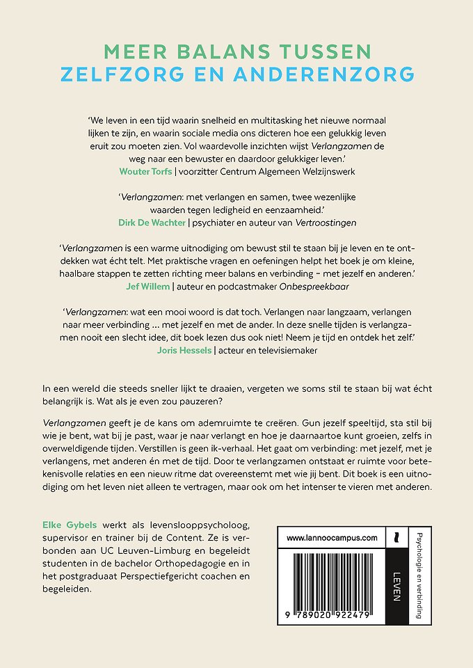 Verlangzamen: wat een mooi woord is dat toch. Verlangen naar langzaam, verlangen naar meer verbinding … met jezelf en met de ander. In deze snelle tijden is verlangzamen nooit een slecht idee, dit boek lezen dus ook niet! Neem je tijd en ontdek het zelf. - Joris Hessels | acteur en televisiemaker