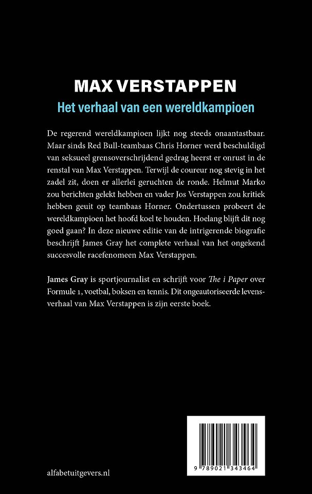 De regerend wereldkampioen lijkt nog steeds onaantastbaar. Maar sinds Red Bull-teambaas Chris Horner werd beschuldigd van seksueel grensoverschrijdend gedrag heerst er onrust in de renstal van Max Verstappen. Terwijl de coureur nog stevig in het zadel zit, doen er allerlei geruchten de ronde. Helmut Marko zou berichten gelekt hebben en vader Jos Verstappen zou kritiek hebben geuit op teambaas Horner. Ondertussen probeert de wereldkampioen het hoofd koel te houden. Hoelang blijft dit nog goed gaan? In deze nieuwe editie van de intrigerende biografie beschrijft James Gray het complete verhaal van het ongekend succesvolle racefenomeen Max Verstappen.