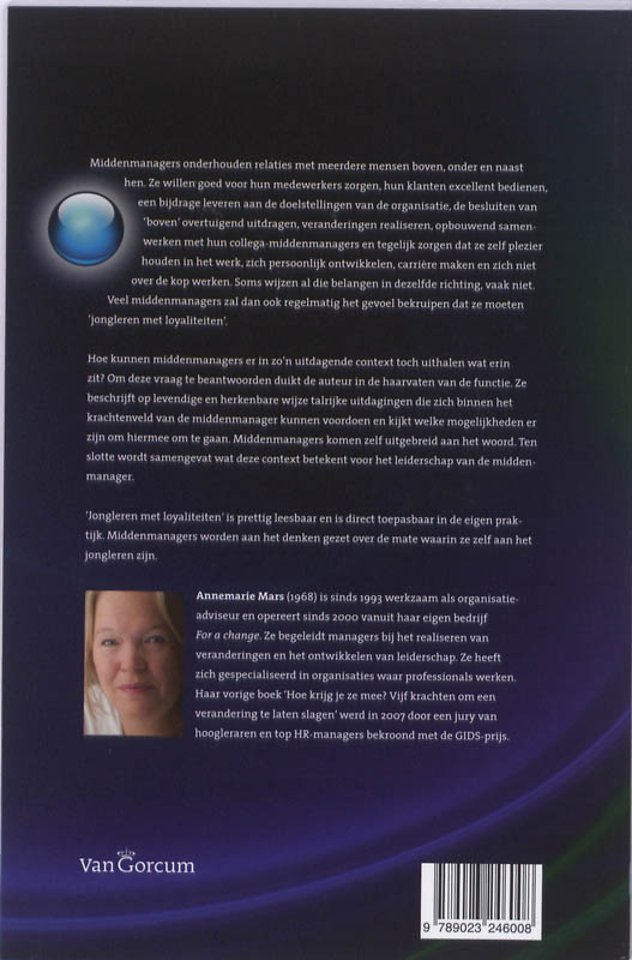 Meer over Annemarie MarsMiddenmanagers onderhouden relaties met meerdere mensen boven, onder en naast hen. Ze willen goed voor hun medewerkers zorgen, hun klanten excellent bedienen, een bijdrage leveren aan de doelstellingen van de organisatie, de besluiten van 'boven' overtuigend uitdragen, veranderingen realiseren, opbouwend samenwerken met hun collega-middenmanagers en tegelijk zorgen dat ze zelf plezier houden in het werk, zich persoonlijk ontwikkelen, carrière maken en zich niet over de kop werken. Soms wijzen al die belangen in dezelfde richting, vaak niet. Veel middenmanagers zal dan ook regelmatig het gevoel bekruipen dat ze moeten 'jongleren met loyaliteiten'.