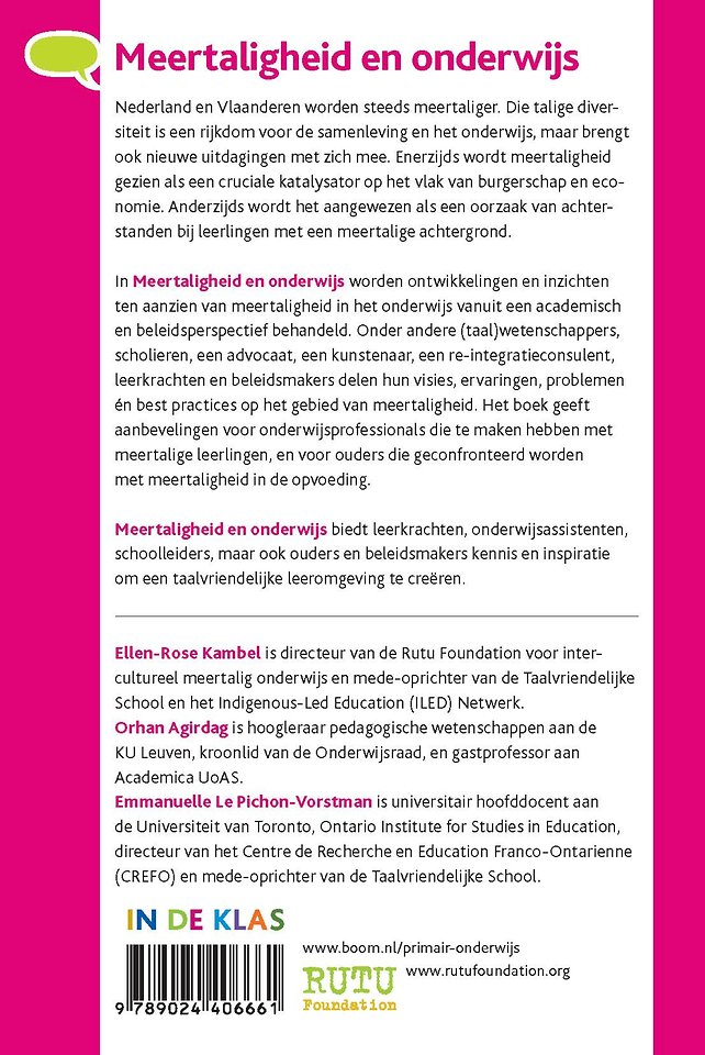 De meertaligheid van leerlingen met een migratie-achtergrond in Nederland en Vlaanderen wordt besproken, maar ook vraagstukken vanuit de onderwijspraktijk van Suriname, Zweden, St. Eustatius en het Fries taalonderwijs komen aan bod. De bijdragen in deze bundel laten zien waarom we meertaligheid juist moeten verwelkomen en stimuleren, zowel binnen als buiten de klas.