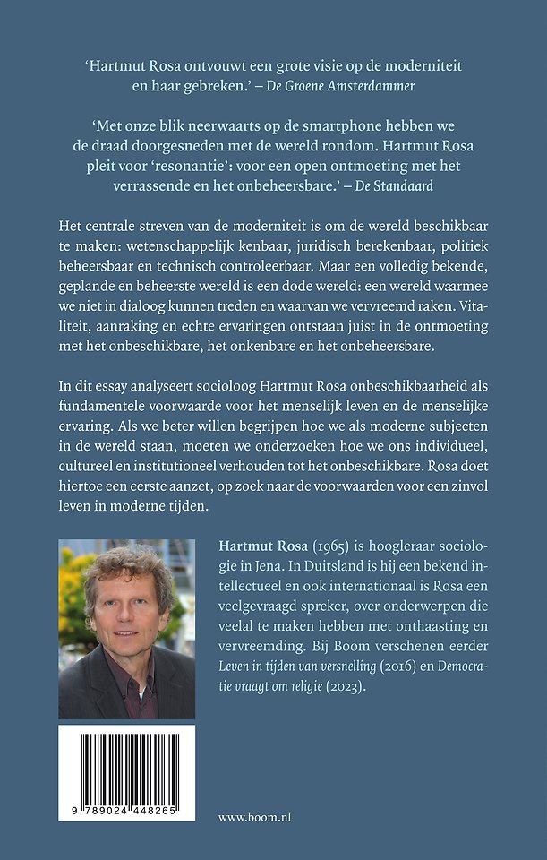 Meer over Hartmut RosaDe drijvende culturele kracht van het wereldbeeld dat wij ‘modern’ noemen, is het verlangen om de wereld beschikbaar te maken: wetenschappelijk kenbaar, juridisch berekenbaar, politiek beheersbaar en technisch controleerbaar. Maar een volledig gekende, geplande en beheerste wereld is een dode wereld: een wereld waarmee we niet in dialoog kunnen treden en waarvan we vervreemd raken. Vitaliteit, aanraking en echte ervaringen ontstaan juist in de ontmoeting met het onbeschikbare, het onkenbare en het onbeheersbare. Zo bezien is onbeschikbaarheid bepalend voor het menselijk leven en de fundamentele menselijke ervaring.