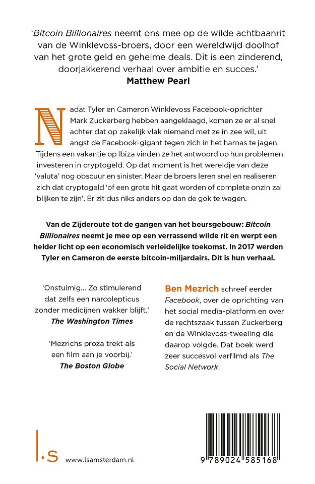 Meer over Ben MezrichIn 2004 klaagden Tyler en Cameron Winklevoss Facebook-oprichter Mark Zuckerberg aan. Na hun confrontatie komen ze er al snel achter dat op zakelijk vlak niemand met ze in zee wil, uit angst de Facebook-gigant tegen zich te krijgen. Tijdens een vakantie op Ibiza vinden ze het antwoord op hun problemen: investeren in cryptogeld. Een aantal jaren later, in 2017, werden Tyler en Cameron de eerste bitcoin-miljardairs. Dit is hun verhaal.