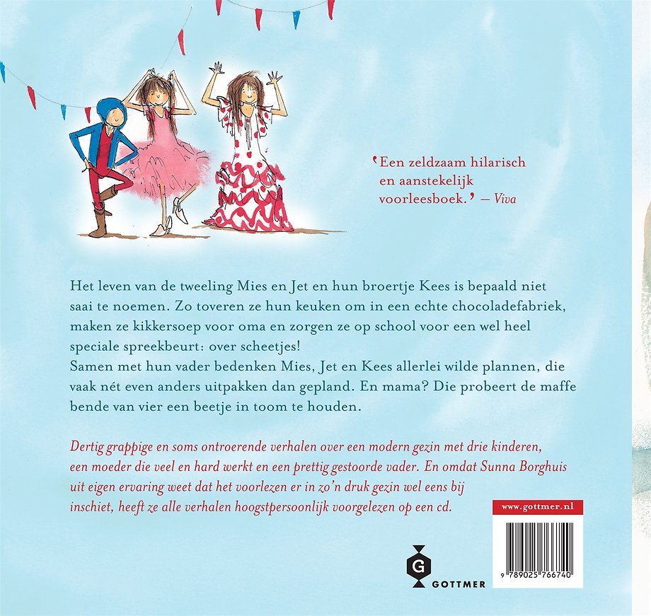 Het leven van de tweeling Mies en Jet en hun broertje Kees is bepaald niet saai te noemen. Zo toveren ze hun keuken om in een echte chocoladefabriek, maken ze kikkersoep voor oma en zorgen ze op school voor een wel heel speciale spreekbeurt: over scheetjes!