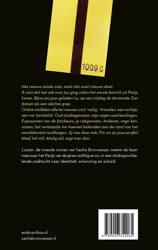 Luister, de tweede roman van Sacha Bronwasser, neemt de lezer mee naar het Parijs van de jaren tachtig en nu, in een zinsbegoochelende zoektocht naar identiteit, vriendschap en schuld.