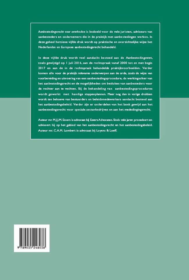 In deze vijfde druk wordt veel aandacht besteed aan de Aanbestedingswet, zoals gewijzigd op 1 juli 2016, en de rechtspraak vanaf 2000 tot en met begin 2017 en aan de in de rechtspraak behandelde praktijkvoorbeelden. Verder komen alle voor de praktijk relevante onderwerpen aan de orde, zoals de wijze van voorbereiding en uitvoering van een aanbestedingsprocedure, de werkingssfeer van het aanbestedingsrecht en de mogelijkheden om besluiten van aanbesteders voor de rechter aan te vechten.