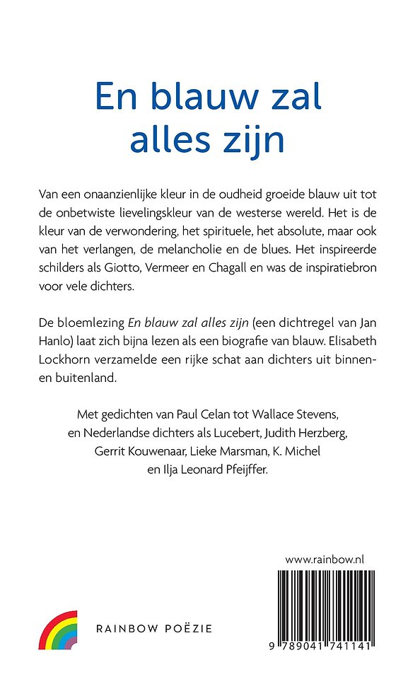 De bloemlezing En blauw zal alles zijn (een dichtregel van Jan Hanlo) laat zich bijna lezen als een biografie van blauw. Elisabeth Lockhorn verzamelde een rijke schat aan dichters uit binnen en buitenland.