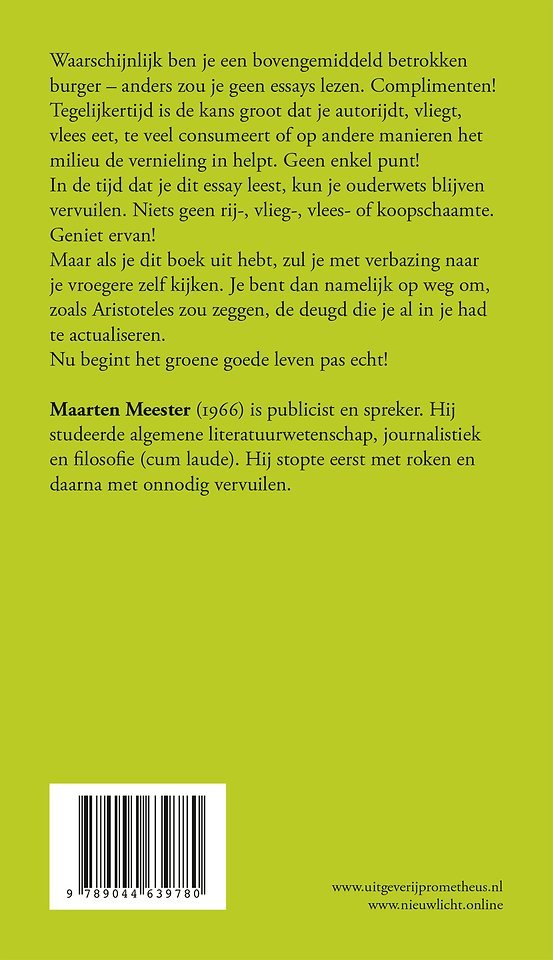 In de tijd dat je dit essay leest, kun je ouderwets blijven vervuilen. Niets geen rij-, vlieg-, vlees- of koopschaamte. Geniet ervan! Maar als je dit boek uit hebt, zul je met verbazing naar je vroegere zelf kijken. Je bent namelijk op weg om, zoals Aristoteles zou zeggen, de deugd die je al in je had te actualiseren. Nu begint het groene leven pas echt!
