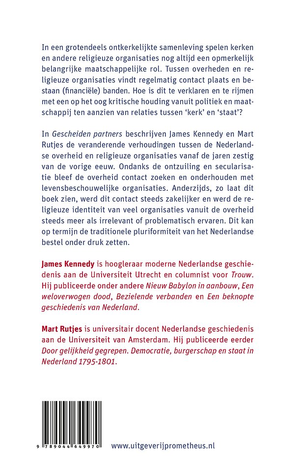 In Gescheiden partners beschrijven James Kennedy en Mart Rutjes de veranderende verhoudingen tussen de Nederlandse overheid en religieuze organisaties vanaf de jaren zestig van de vorige eeuw. Ondanks de ontzuiling en secularisatie bleef de overheid contact zoeken en onderhouden met levensbeschouwelijke organisaties. Anderzijds, zo laat dit boek zien, werd dit contact steeds zakelijker en werd de religieuze identiteit van veel organisaties vanuit de overheid steeds meer als irrelevant of problematisch ervaren. Dit kan op termijn de traditionele pluriformiteit van het Nederlandse bestel onder druk zetten.