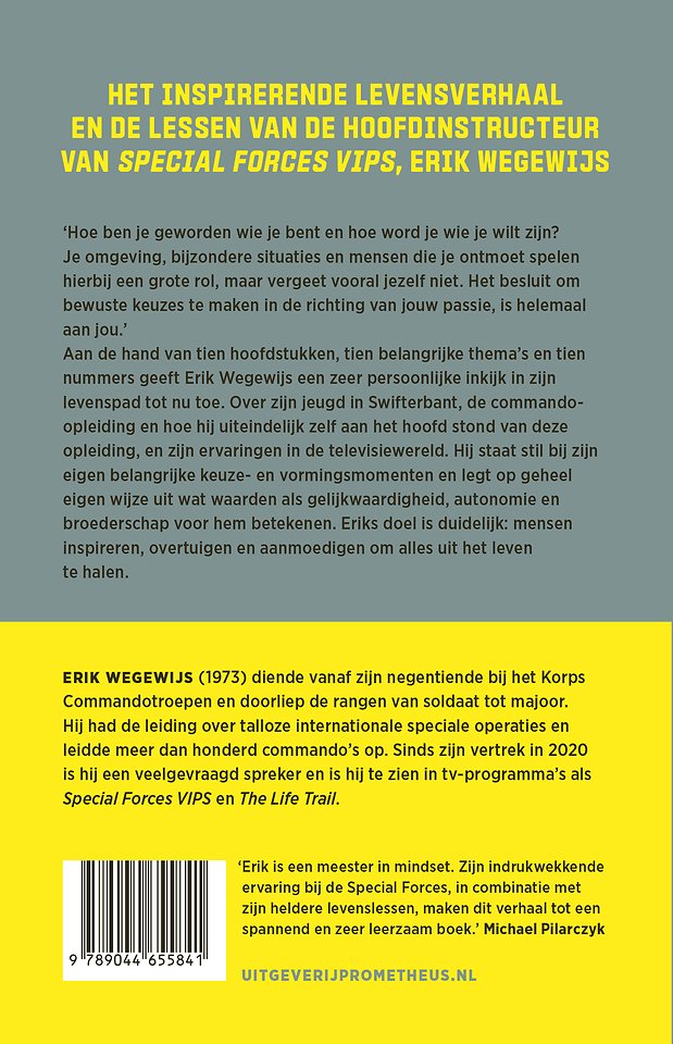 Erik Wegewijs (1973) diende vanaf zijn negentiende bij het Korps Commandotroepen en doorliep de rangen van soldaat tot majoor. Hij had de leiding over talloze internationale speciale operaties en leidde meer dan honderd commando’s op. Sinds zijn vertrek in 2020 is hij een veelgevraagd spreker en is hij te zien in tv-programma’s als Special Forces VIPS en The Life Trail.