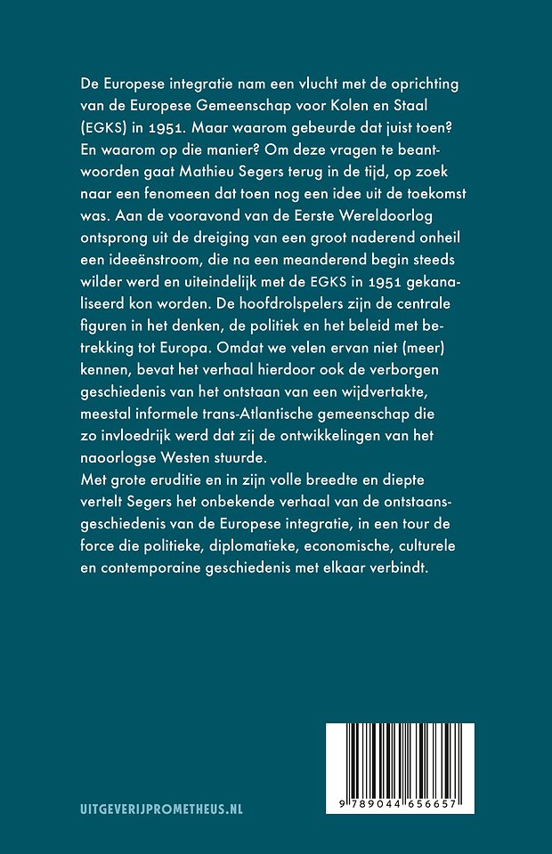 De Europese integratie nam een vlucht met de oprichting van de Europese Gemeenschap voor Kolen en Staal (EGKS) in 1950. Maar waarom gebeurde dat juist toen? En waarom op die manier? Om deze vragen te beantwoorden gaat Mathieu Segers terug in de tijd, op zoek naar een fenomeen dat toen nog een idee uit de toekomst was. Aan de vooravond van de Eerste Wereldoorlog ontsprong uit de dreiging van een groot naderend onheil een ideeënstroom die na een meanderend begin steeds wilder werd en uiteindelijk met de EGKS gekanaliseerd kon worden.