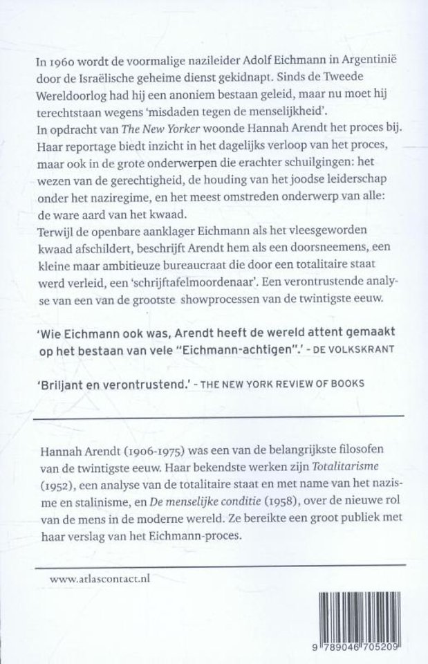 In opdracht van het tijdschrift The New Yorker woonde Hannah Arendt het proces bij. Haar reportage biedt inzicht in het dagelijks verloop van het proces, maar ook in de grote onderwerpen die erachter schuilgingen: het wezen van de gerechtigheid, de houding van het joodse leiderschap onder het naziregime, en het meest omstreden onderwerp van alle: het wezen van het kwaad. Terwijl de openbare aanklager Eichmann als het vleesgeworden kwaad afschildert, beschrijft Arendt hem als een doorsneemens, een kleine, maar ambitieuze bureaucraat die door een totalitaire staat werd verleid. Een verontrustende analyse van een van de grootste showprocessen van de twintigste eeuw.