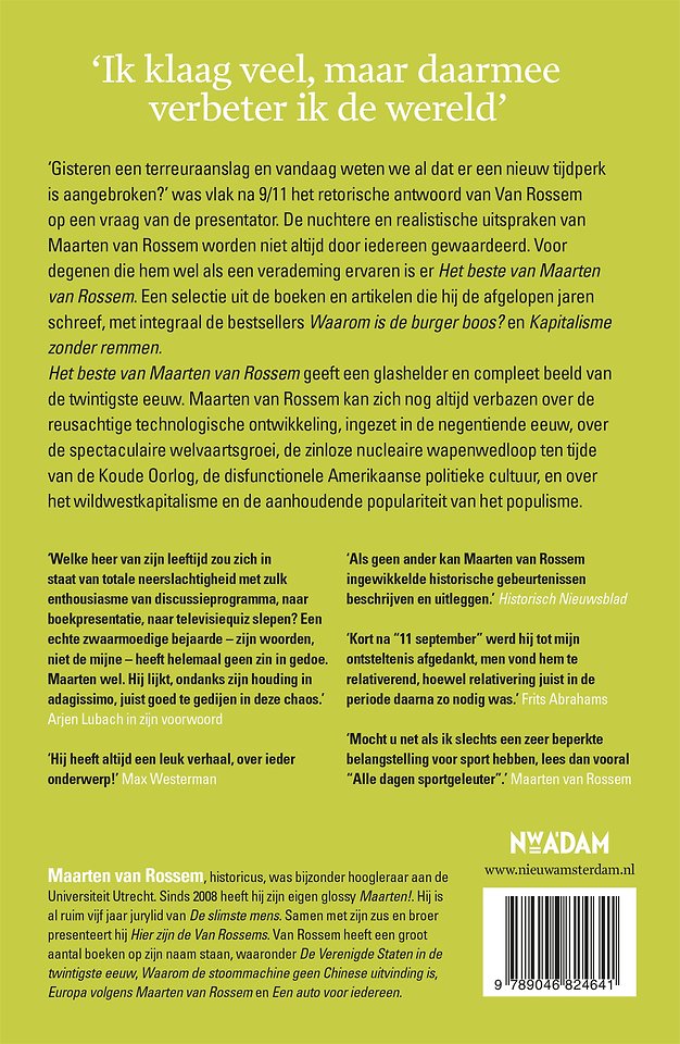 Het beste van Maarten van Rossem geeft een glashelder en compleet beeld van de twintigste eeuw. Maarten van Rossem kan zich nog altijd verbazen over de reusachtige technologische ontwikkeling, ingezet in de negentiende eeuw, over de spectaculaire welvaartsgroei, de zinloze nucleaire wapenwedloop ten tijde van de Koude Oorlog, de disfunctionele Amerikaanse politieke cultuur, en over het wildwestkapitalisme en de aanhoudende populariteit van het populisme.