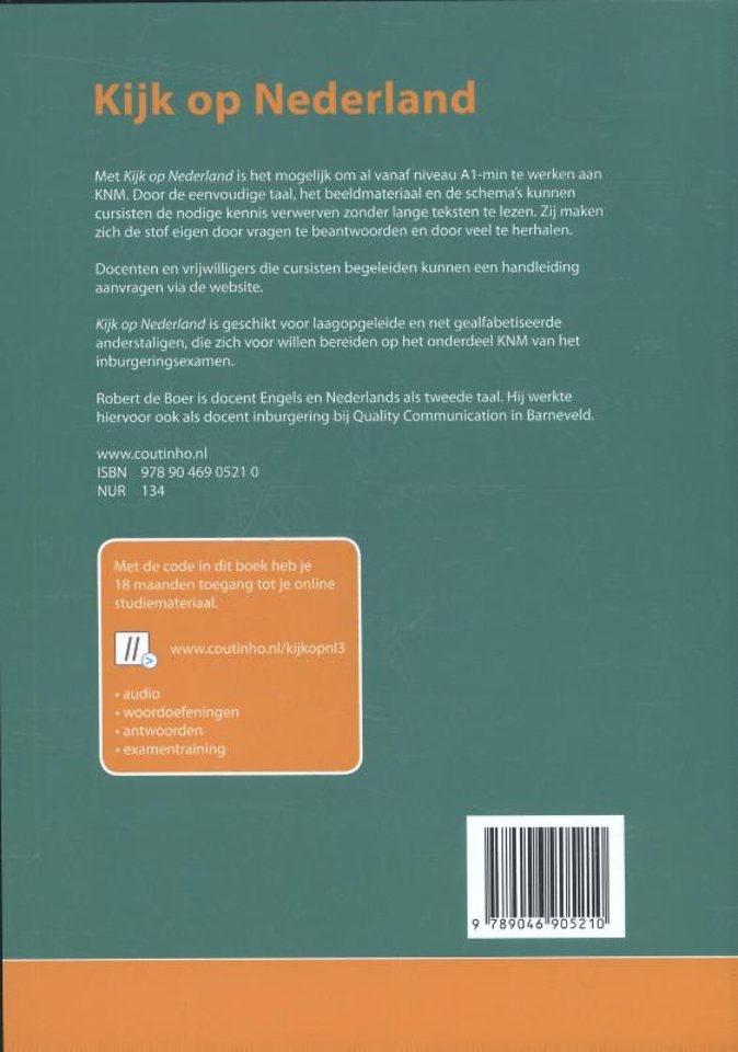 Met Kijk op Nederland is het mogelijk om al vanaf niveau A1-min te werken aan KNM. Door de eenvoudige taal, het beeldmateriaal en de schema's kunnen cursisten de nodige kennis verwerven zonder lange teksten te lezen. Zij maken zich de stof eigen door vragen te beantwoorden en door veel te herhalen.