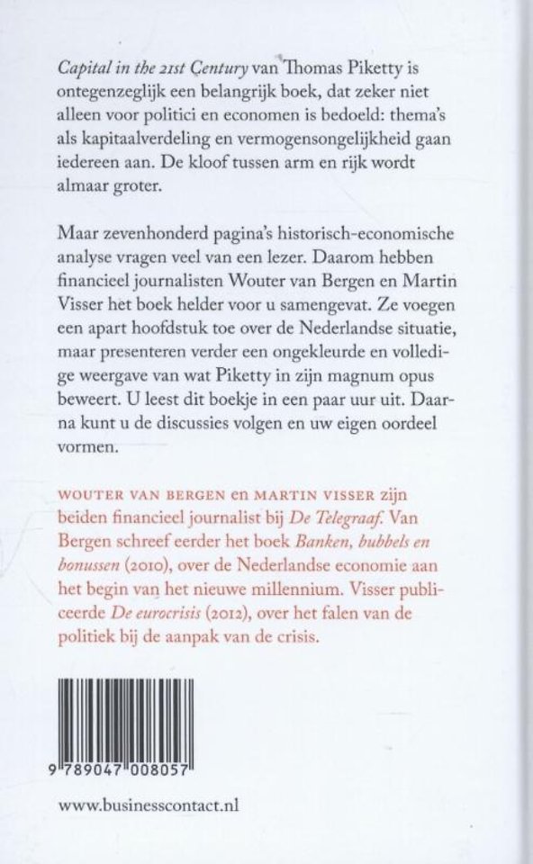 Maar 700 pagina’s historisch-economische analyse vraagt veel van een lezer. Daarom hebben financieel journalisten Wouter van Bergen en Martin Visser het boek helder voor u samengevat. Ze voegen een apart hoofdstuk toe over de Nederlandse situatie, maar presenteren verder een ongekleurde en volledige weergave van wat Piketty in zijn magnum opus beweert. U leest dit boekje in hooguit twee uur uit. Daarna kunt u de discussies volgen en uw eigen oordeel vormen.