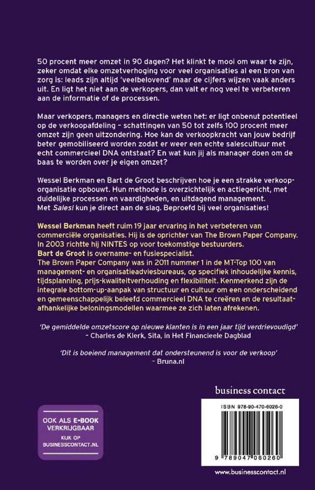 In dit boek beschrijven Wessel Berkman en Bart de Groot hoe u uw verkooporganisatie kunt versterken - structureel en 'bottom-up', dus samen met alle verkopers en alle klanten. Alleen zo krijgt u het benodigde commitment. Geen fata morgana's, geen Sunshine-pumpverhalen, geen hoogdravende visies meer maar overzichtelijke en actiegerichte processen. Belangrijk daarbij is management dat er niet omheen draait en geen concessies doet aan de gemaakte afspraken. De inzet is een lerende organisatie bouwen die levert wat de klant echt nodig heeft en verdient. Hiervoor is een basis nodig die iedereen snapt en eenvoudig kan uitvoeren: een eenduidig verkoopplatform, met een duidelijke taal die door iedereen (ook nieuwe verkopers!) gehanteerd wordt. De processen in 'Sales!' worden al ruim 10 jaar met succes ingezet.