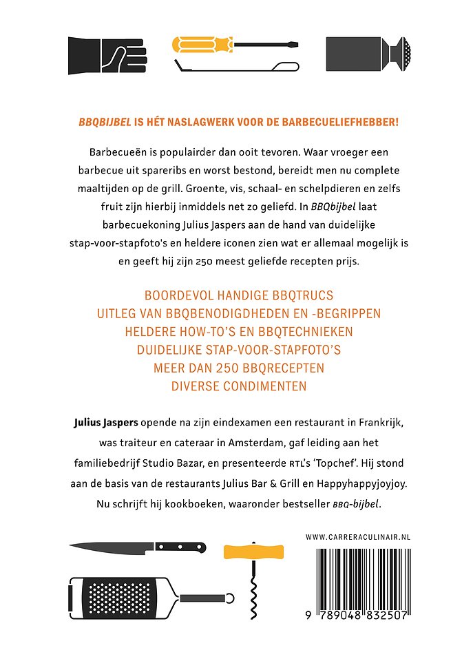 Julius Jaspers (1962) opende na zijn eindexamen een restaurant in Frankrijk, was traiteur en cateraar in Amsterdam, gaf leiding aan het familiebedrijf Studio Bazar, en presenteerde RTL's 'Topchef'. Nu schrijft hij kookboeken, 'BBQbijbel' is zijn tiende boek, en heeft hij twee restaurants in Amsterdam waaronder Julius Bar & Grill.