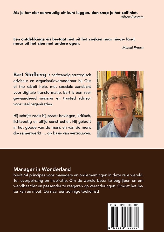 Manager in Wonderland biedt 64 principes voor managers en ondernemingen in deze rare wereld. Ter overpeinzing en inspiratie. Om de wereld beter te begrijpen en om wendbaarder en passender te reageren op veranderingen. Omdat het beter kan en moet. Op naar een zonnige toekomst!