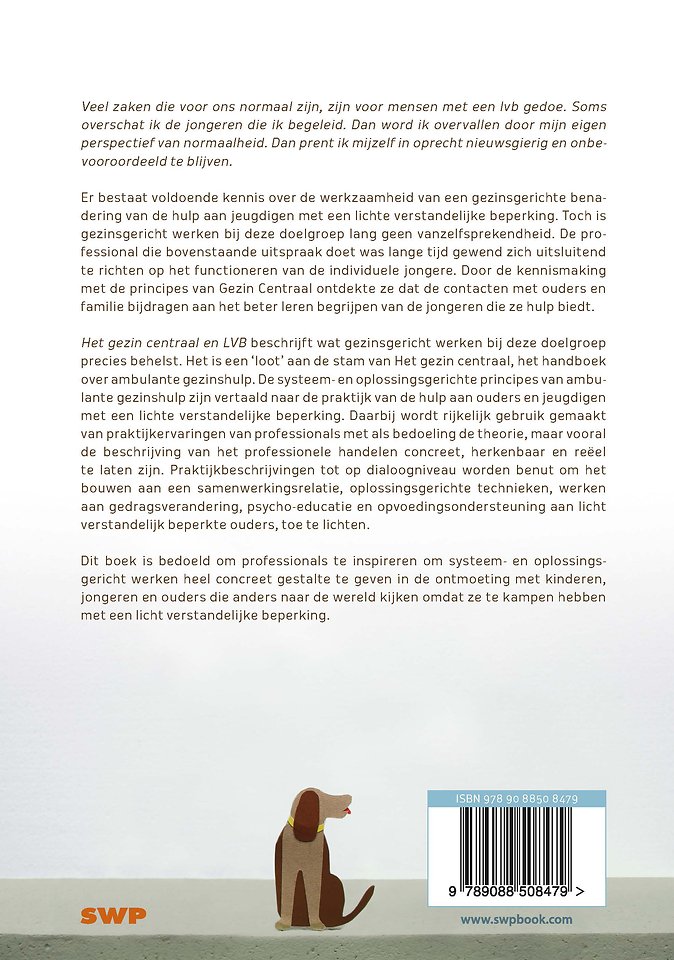 Het gezin centraal en LVB beschrijft wat gezinsgericht werken bij deze doelgroep precies behelst. Dit boek is een ‘loot’ aan de stam van ‘Het gezin centraal’, het handboek over ambulante gezinshulp. De systeem- en oplossingsgerichte principes van ambulante gezinshulp zijn vertaald naar de praktijk van de hulp aan ouders en jeugdigen met een lichte verstandelijke beperking. Daarbij wordt rijkelijk gebruik gemaakt van praktijkervaringen van professionals met als bedoeling de theorie, maar vooral de beschrijving van het professionele handelen concreet, herkenbaar en reëel te laten zijn. Praktijkbeschrijvingen tot op dialoogniveau worden benut om het bouwen aan een samenwerkingsrelatie, oplossingsgerichte technieken, werken aan gedragsverandering, psycho-educatie en opvoedingsondersteuning aan licht verstandelijk beperkte ouders, toe te lichten.