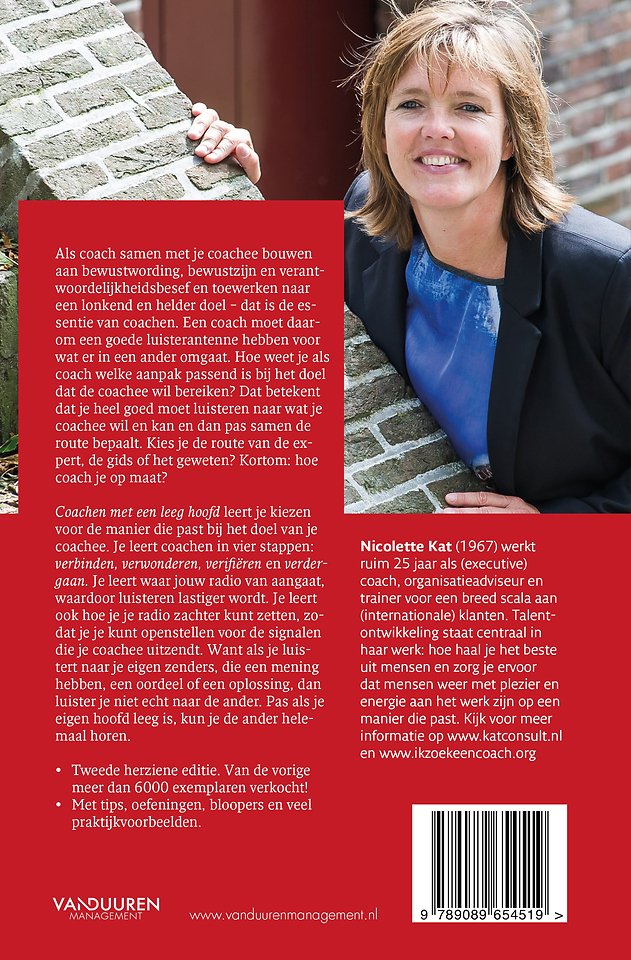 Coachen met een leeg hoofd leert je kiezen voor de manier die past bij het doel van je coachee. Je leert coachen in vier stappen: verbinden, verwonderen, verifiëren en verdergaan. Je leert waar jouw radio van aangaat, waardoor luisteren lastiger wordt. Je leert ook hoe je je radio zachter kunt zetten, zodat je je kunt openstellen voor de signalen die je coachee uitzendt. Want als je luistert naar je eigen zenders, die een mening heb¬ben, een oordeel of een oplossing, dan luister je niet echt naar de ander. Pas als je eigen hoofd leeg is, kun je de ander helemaal horen.