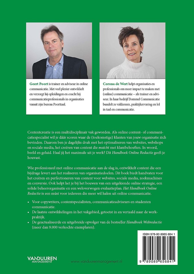 Wie professioneel met online communicatie aan de slag is, ontwikkelt content die een bijdrage levert aan het realiseren van organisatiedoelen. Dit boek biedt handvaten voor het creëren en perfectioneren van content voor websites, sociale media, zoekmachines en conversie. Ook helpt het je bij het bouwen van een uitgekiende online strategie, een solide beheerorganisatie en een weloverwogen evaluatieplan. Het Handboek Online Redactie is een múst voor iedereen die meer wil halen uit online communicatie.