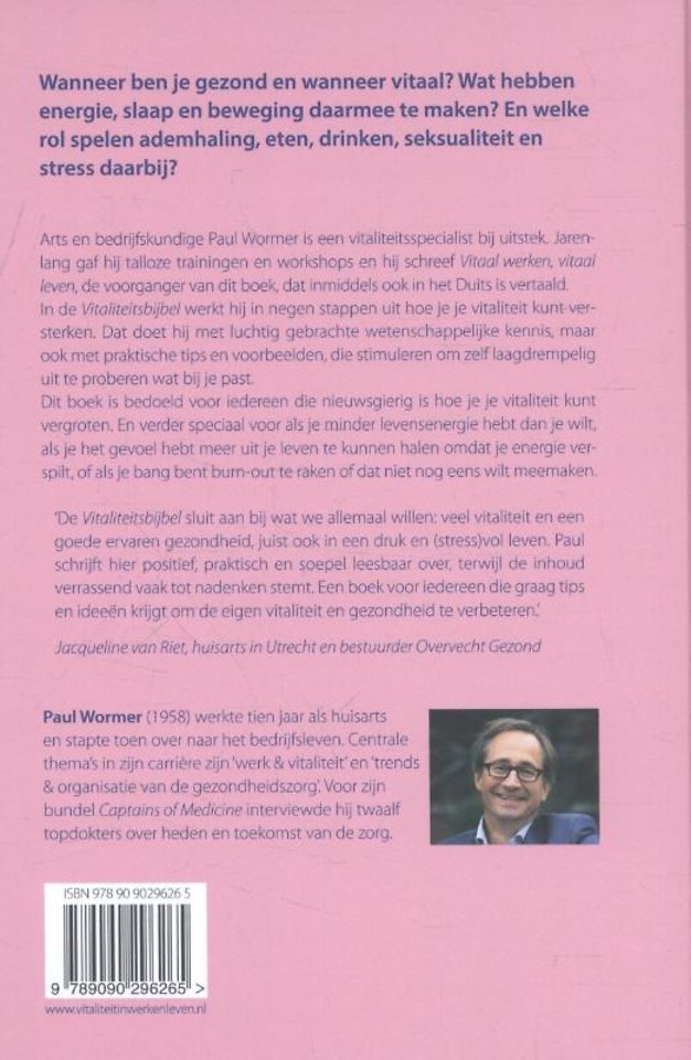 Arts en bedrijfskundige Paul Wormer is een vitaliteitsspecialist bij uitstek. Jarenlang gaf hij talloze trainingen en workshops en hij schreef 'Vitaal werken, vitaal leven' de voorganger van dit boek, dat inmiddels ook in het Duits is vertaald. In de 'Vitaliteitsbijbel' legt hij in negen stappen uit hoe je je vitaliteit kunt versterken. Dat doet hij met luchtig gebrachte wetenschappelijke kennis, maar ook met praktische tips en voorbeelden, die stimuleren om zelf laagdrempelig uit te proberen wat bij je past.