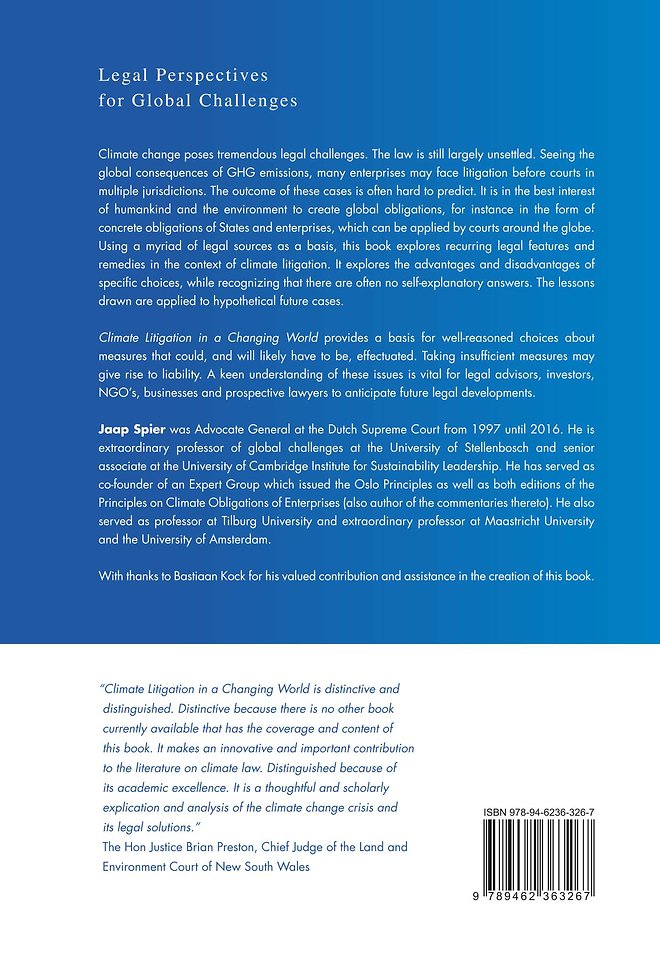 Climate Litigation in a Changing World provides a basis for well-reasoned choices about measures that could, and will likely have to be, effectuated. Taking insufficient measures may give rise to liability. A keen understanding of these issues is vital for legal advisors, investors, NGO’s, businesses and prospective lawyers to anticipate future legal developments.