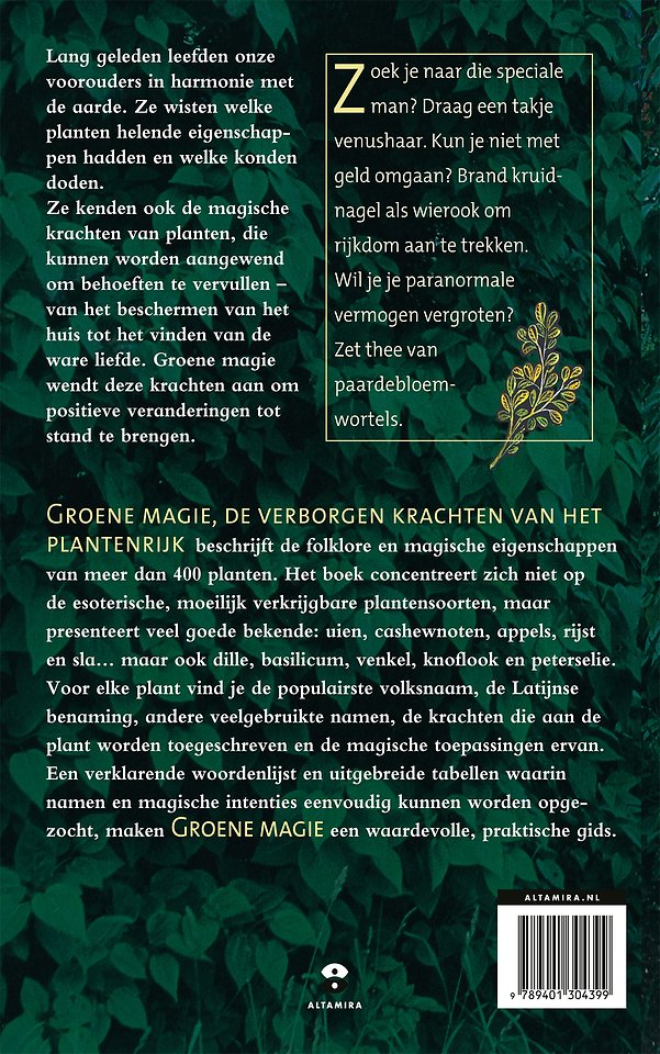 Het handboek 'Groene magie' beschrijft de folklore en magische eigenschappen van meer dan vierhonderd planten. En dan niet zozeer de moeilijk verkrijgbare soorten, maar vooral oude bekenden. Denk: uien, cashewnoten, appels, rijst, sla, dille, basilicum, venkel, knoflook en peterselie.