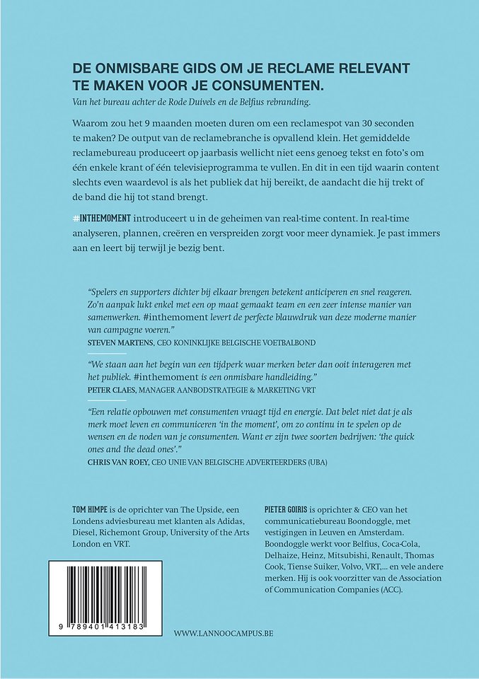 '#inthemoment' introduceert u in de geheimen van real-time content. Real-time analyseren, plannen, creëren en verspreiden, zorgt voor meer dynamiek en laat toe uw beperkte middelen optimaal te benutten. U past immers aan en leert bij terwijl u bezig bent.