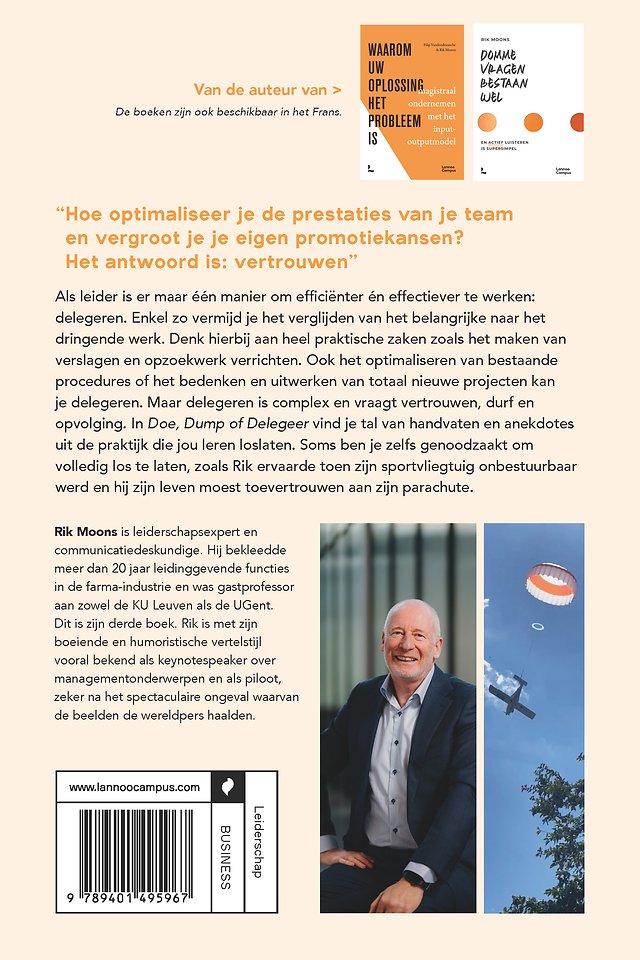 In Doe, Dump of Delegeer vind je tal van handvaten en anekdotes uit de praktijk die jou leren loslaten. Soms ben je zelfs genoodzaakt om volledig los te laten, zoals Rik ervaarde toen zijn sportvliegtuig onbestuurbaar werd en hij zijn leven moest toevertrouwen aan zijn parachute.