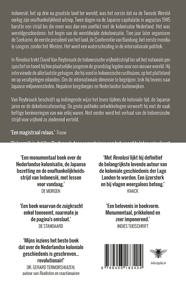 Vijf jaar lang werkte David Van Reybrouck aan zijn monumentale Revolusi. Hij interviewde bijna tweehonderd mensen, de laatste nog levende getuigen van de onafhankelijkheidsstrijd, in Indonesische rusthuizen, Japanse miljoenensteden en op verafgelegen eilanden. Ook in Nederland bracht zijn onderzoek tal van nieuwe verhalen aan het licht. De veelheid aan perspectieven en herinneringen weeft Van Reybrouck samen tot het aangrijpende verhaal van de Indonesische onafhankelijkheid. Zo toont hij hoe een nieuwe wereld vorm kreeg: in bloed, in pijn, met hoop.