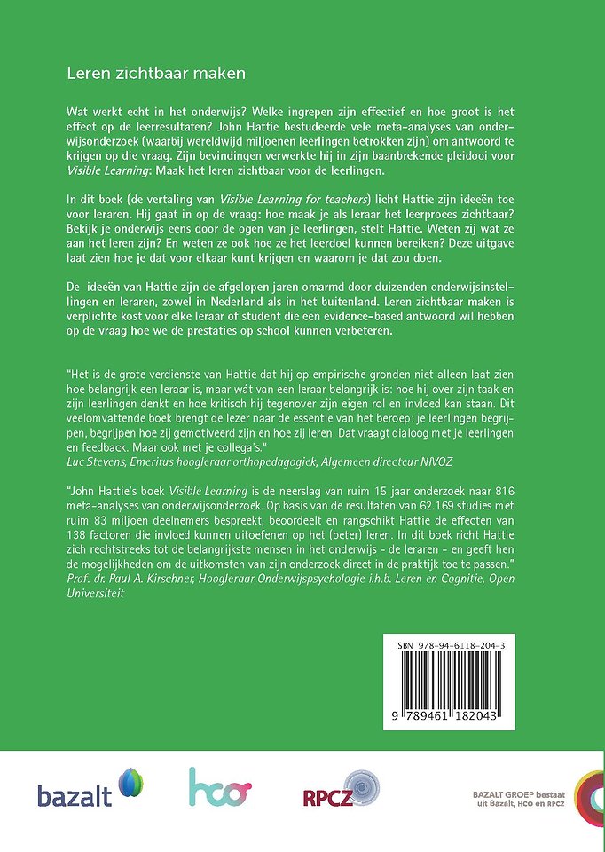 Het baanbrekende boek Visible Learning van John Hattie bevat de resultaten van meer dan vijftien jaar onderzoek waarbij miljoenen leerlingen zijn betrokken. Daarnaast bevat het de grootste verzameling van evidence-based onderzoek over wat feitelijk werkt op school om het leren te verbeteren. Leren zichtbaar maken (Visible Learning for teachers) is de volgende stap. Het maakt die vernieuwende ideeën voor een volledig nieuw publiek toegankelijk. Het is geschreven voor studenten, voor aankomende en al ervaren leraren en het legt uit hoe de principes van Visible Learning in elk klaslokaal, waar ook ter wereld, kunnen worden toegepast. De auteur geeft bondige en goed te begrijpen samenvattingen van de succesvolste methoden en biedt een stap-voor-stapbegeleiding voor een geslaagde invoering van Visible Learning en Visible teaching in de klas. Dit boek:- verbindt het grootste onderzoeksproject ooit van onderwijsstrategieën naar een praktische invoering in het klaslokaal;- komt op voor zowel leraar en leerling perspectief en bevat stap-voor-stapbegeleiding voor lesvoorbereiding, het verklaren van leren en feedback tijdens de les en de follow-up;- biedt checklists, oefeningen, casestudy's en succesvolle praktijkvoorbeelden om resultaten te verbeteren;- bevat checklists voor de hele school en adviezen voor Visible Learning voor schoolleiders;- bevat aanvullende meta-analyses waardoor het totale aantal geciteerde onderzoeken boven de 900 uitstijgt;- bestrijkt op begrijpelijke wijze veel onderwijsonderwerpen, zoals leerlingmotivatie, onderwijsprogramma, meta-cognitieve strategieën, gedrag, instructiestrategieën en klassenmanagement. Leren zichtbaar maken is verplichte kost voor elke student of leraar die een evidence-based antwoord wil hebben op de vraag hoe we de prestaties op school kunnen verbeteren. John Hattie is professor en directeur bij het Melbourne Education Research Institute van de University of Melbourne in Australië en ere-professor aan de University of Auckland in Nieuw-Zeeland. Hij is de auteur van Visible Learning en coauteur van Intelligence and Intelligence Testing.De uitkomsten van Hattie's onderzoek zijn vertaald naar een praktisch model voor scholen, om gericht te werken aan de impact die de school heeft op leerprestaties van leerlingen.