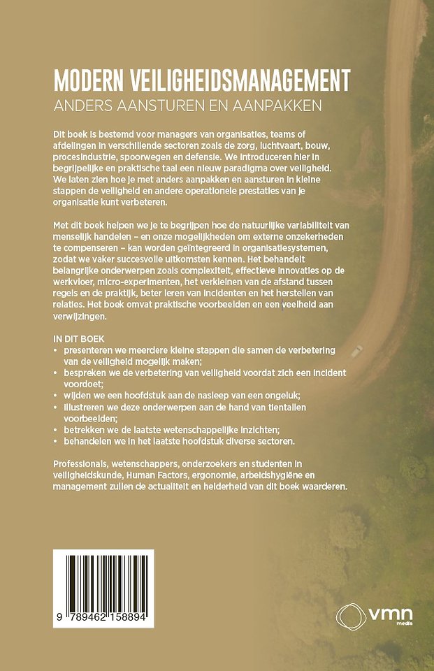 Dit boek is bestemd voor managers van organisaties, teams of afdelingen in verschillende sectoren zoals de zorg, luchtvaart, bouw, procesindustrie, spoorwegen en defensie. We introduceren hier in begrijpelijke en praktische taal een nieuw paradigma over veiligheid. We laten zien hoe je met anders aanpakken en aansturen in kleine stappen de veiligheid en andere operationele prestaties van je organisatie kunt verbeteren.