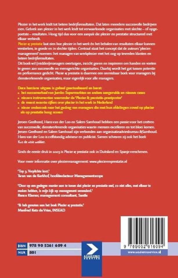 Meer over de auteursPlezier in het werk leidt tot betere bedrijfsresultaten. Dat laten meerdere succesvolle bedrijven zien. Gebrek aan plezier in het werk leidt tot verwaarloosde organisaties met slechte - of opgepoetste - resultaten. Hoog tijd dus voor een aanpak die plezier en prestatie structureel met elkaar verbindt.