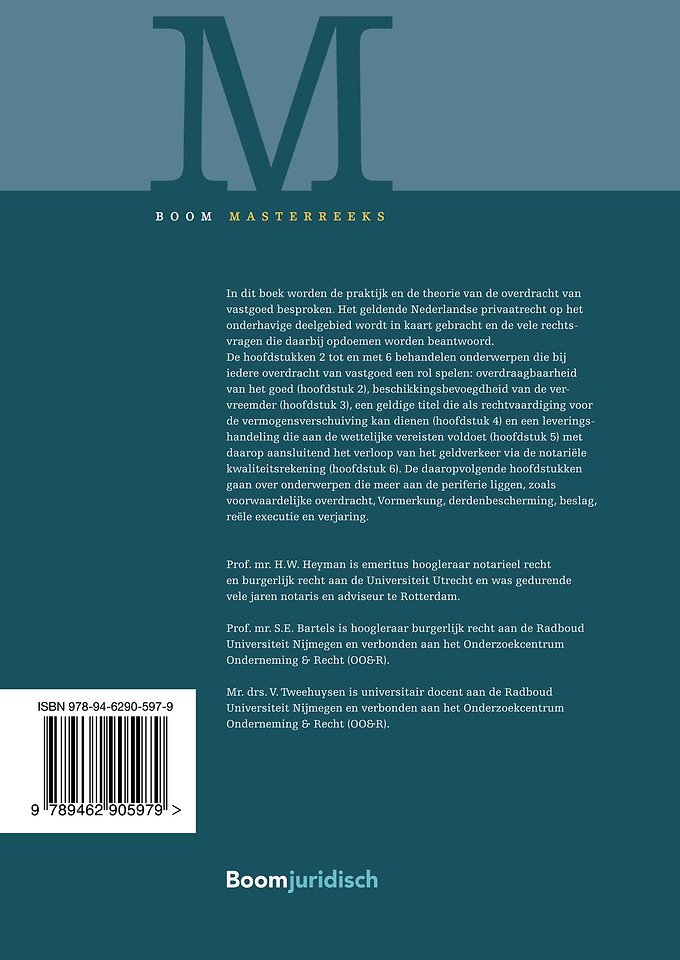 In dit boek worden de praktijk en de theorie van de overdracht van vastgoed besproken. Het geldende Nederlandse privaatrecht op het onderhavige deelgebied wordt in kaart gebracht en vele rechtsvragen die daarbij opdoemen worden beantwoord.