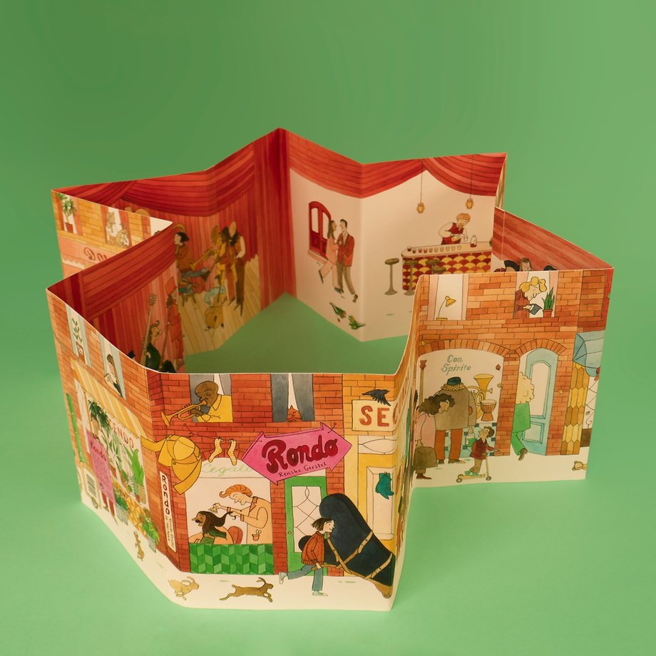 In Rondo, het nieuwe, kleurrijke uitklapboek van Renske Gerstel, valt al wandelend door een drukke winkelstraat van alles te ontdekken. Konijnen rennen voorbij, vanuit een raam spelen kinderen met grote marionetten en op de grond ligt een verloren knuffel. Sommige voorbijgangers dragen vreemde koffers. Wat zou daarin zitten? En waar gaan al deze mensen naartoe?