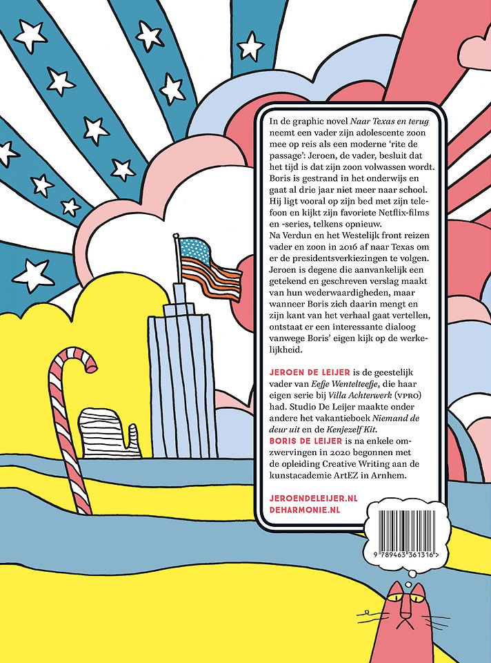 In de graphic novel Naar Texas en terug neemt een vader zijn adolescente zoon mee op reis als een moderne ‘rite de passage’: Jeroen, de vader, besluit dat het tijd is zijn zoon te begeleiden naar volwassenheid. Boris is gestrand in het onderwijs en gaat al drie jaar niet naar school. Hij ligt vooral op zijn bed met zijn telefoon en kijkt zijn favoriete Netflix-films en -series, telkens opnieuw. Na Verdun en het Westelijk front, reizen ze in 2016 af naar Texas om er de presidentsverkiezingen te volgen. Jeroen is degene die aanvankelijk een getekend en geschreven verslag van hun wederwaardigheden maakt, maar wanneer Boris zich daarin mengt en zijn kant van het verhaal gaat vertellen, ontstaat er een interessante dialoog vanwege Boris’ andere kijk op de werkelijkheid; informatie die via de zintuigen binnenkomt verwerkt hij op een radicaal andere wijze.