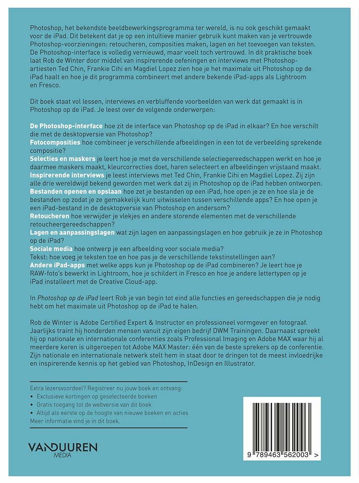 Photoshop, het bekendste beeldbewerkingsprogramma ter wereld, is nu ook geschikt gemaakt voor de iPad. Dit betekent dat je op een intuïtieve manier gebruik kunt maken van je vertrouwde Photoshop-voorzieningen: retoucheren, composities maken, lagen en het toevoegen van teksten. De Photoshop-interface is volledig vernieuwd, maar voelt toch vertrouwd. In dit praktische boek laat Rob de Winter door middel van inspirerende oefeningen en interviews met Photoshop-artiesten Ted Chin, Frankie Cihi en Magdiel Lopez zien hoe je het maximale uit Photoshop op de iPad haalt en hoe je dit programma combineert met andere bekende iPad-apps als Lightroom en Fresco.