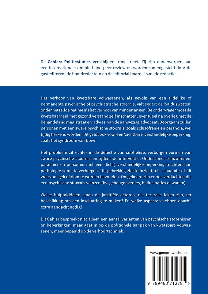 Dit Cahier bespreekt niet alleen een aantal varianten van psychische stoornissen en beperkingen, maar gaat in op de politionele aanpak van kwetsbare volwassenen, meer bepaald op de verhoortechniek.