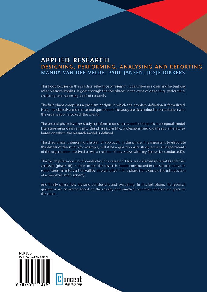 This book focuses on the practical relevance of research. It describes in a clear and factual way what research implies. It goes through the five phases in the cycle of designing, performing, analysing and reporting applied research.