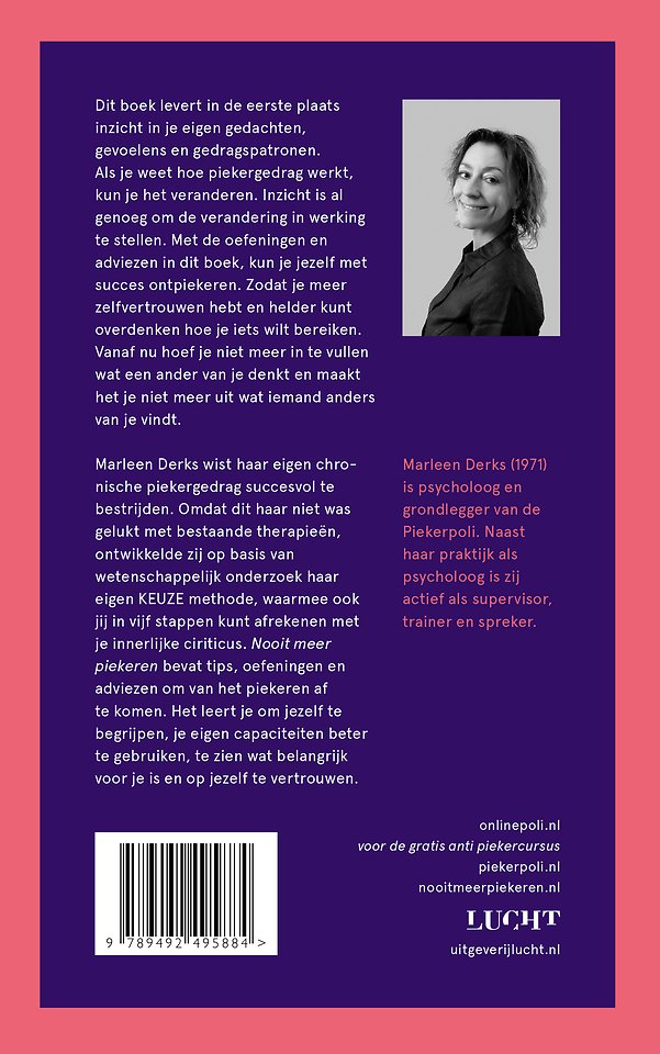 Dit boek levert in de eerste plaats inzicht in je eigen gedachten, gevoelens en gedragspatronen. Als je weet hoe piekergedrag werkt, kun je het veranderen. Inzicht is al genoeg om de verandering in werking te stellen. Met de oefeningen en adviezen in dit boek, kun je jezelf met succes ontpiekeren. Zodat je meer zelfvertrouwen hebt en helder kunt overdenken hoe je iets wilt bereiken. Vanaf nu hoef je niet meer in te vullen wat een ander van je denkt en maakt het je niet meer uit wat iemand anders van je vindt.