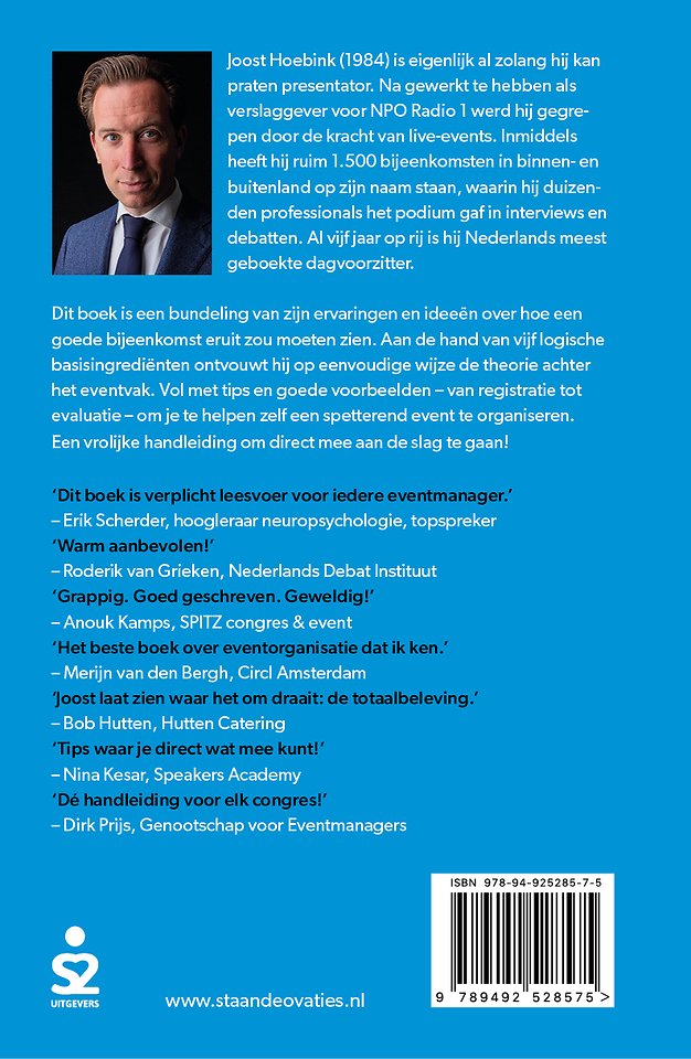 Dit boek is een bundeling van zijn ervaringen en ideeën over hoe een goede bijeenkomst eruit zou moeten zien. Aan de hand van vijf logische basisingrediënten ontvouwt hij op eenvoudige wijze de theorie achter het eventvak. Vol met tips en goede voorbeelden – van registratie tot evaluatie – om je te helpen zelf een spetterend event te organiseren. Een vrolijke handleiding om direct mee aan de slag te gaan!