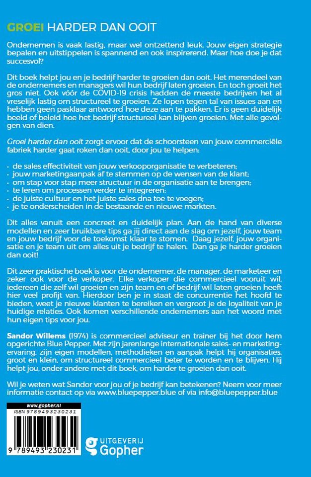 Dit boek helpt jou en je bedrijf harder te groeien dan ooit. Het merendeel van de ondernemers en managers wil hun bedrijf laten groeien. En toch groeit het gros niet. Ook vóór de COVID-19 crisis hadden de meeste bedrijven het al vreselijk lastig om structureel te groeien. Ze lopen tegen tal van issues aan en hebben geen pasklaar antwoord hoe deze aan te pakken. Er is geen duidelijk beeld of beleid hoe het bedrijf structureel kan blijven groeien. Met alle gevolgen van dien.