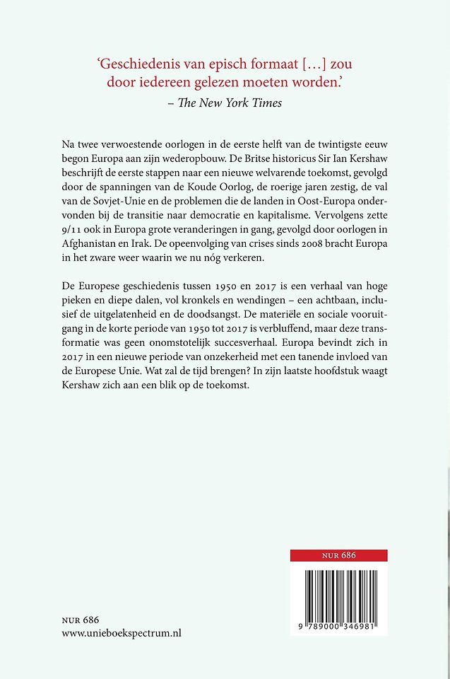 Na twee verwoestende oorlogen in de eerste helft van de twintigste eeuw begint Europa aan zijn wederopbouw. Ian Kershaw beschrijft de eerste stappen naar een nieuwe, ogenschijnlijk welvarende toekomst, die echter wordt geteisterd door de spanningen van de Koude Oorlog, de economische groei en de sociale gevolgen daarvan, de roerige jaren zestig, de val van de Sovjet-Unie en de problemen die de landen in Oost-Europa ondervonden bij de transitie naar democratie en kapitalisme. Vervolgens zette 9/11 ook in Europa grote veranderingen in gang, gevolgd door oorlogen in Afghanistan en Irak. De opeenvolging van crises sinds 2008 bracht Europa in het zware weer waarin we nu nog verkeren.