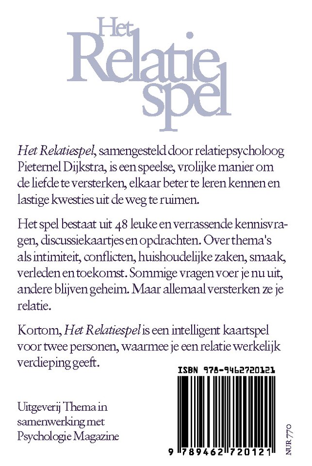 'Het Relatiespel', samengesteld door relatiepsycholoog Pieternel Dijkstra, is een speelse, vrolijke manier om de liefde te versterken, elkaar beter te leren kennen en lastige kwesties uit de weg te ruimen.